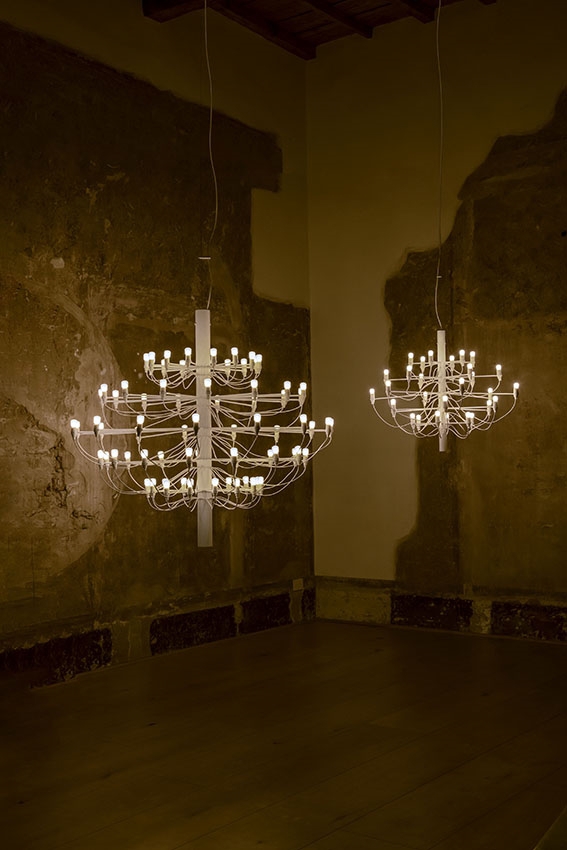 Der Flos 2097 ist in verschiedenen Größen und Oberflächen erhältlich, was es ermöglicht, die Variante zu finden, die perfekt zur Größe und zum Stil des Raumes passt. Ob über dem Esstisch, im Eingangsbereich oder in einem hohen Raum, er liefert einen beeindruckenden visuellen Ausdruck und ein angenehmes, diffuses Licht.