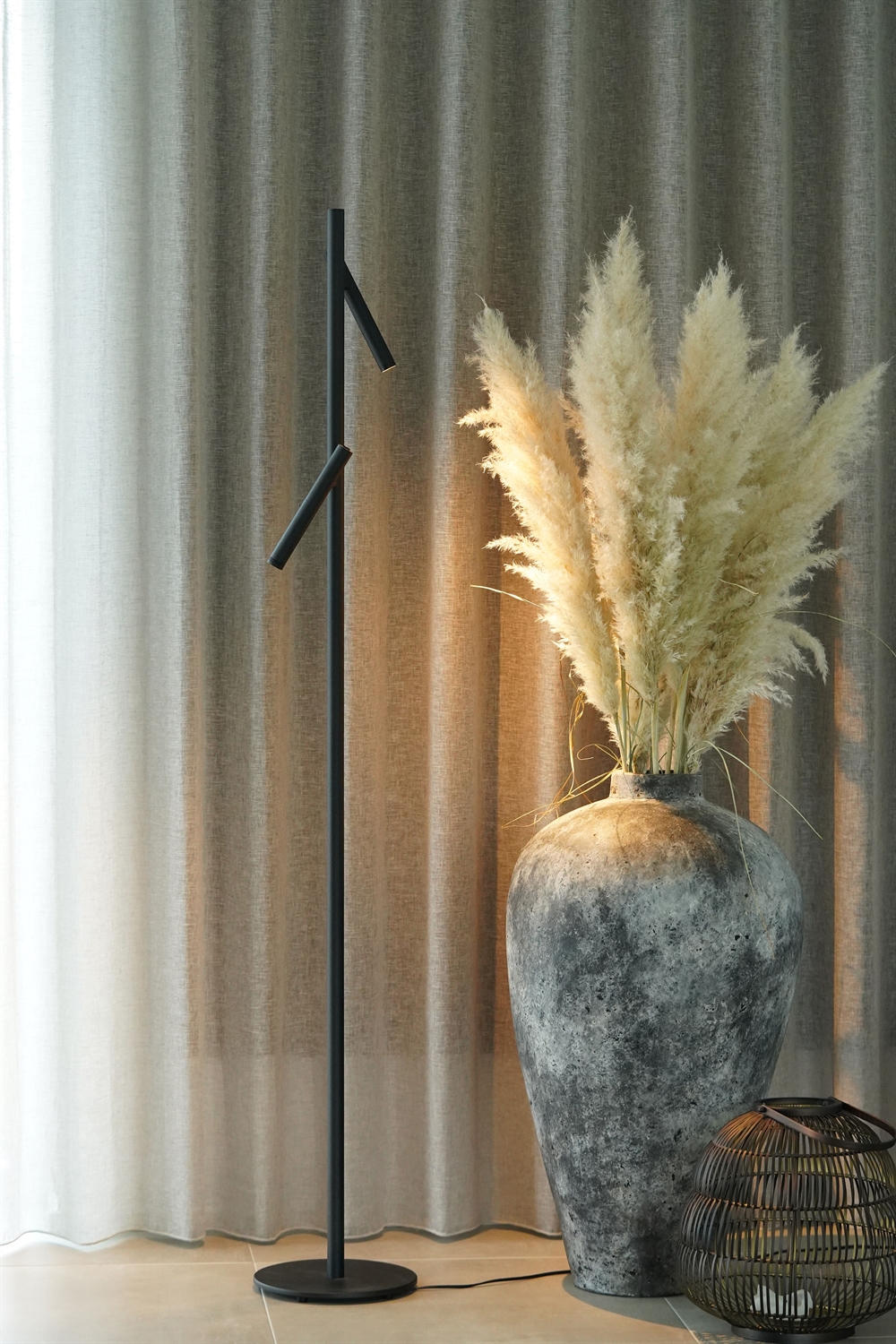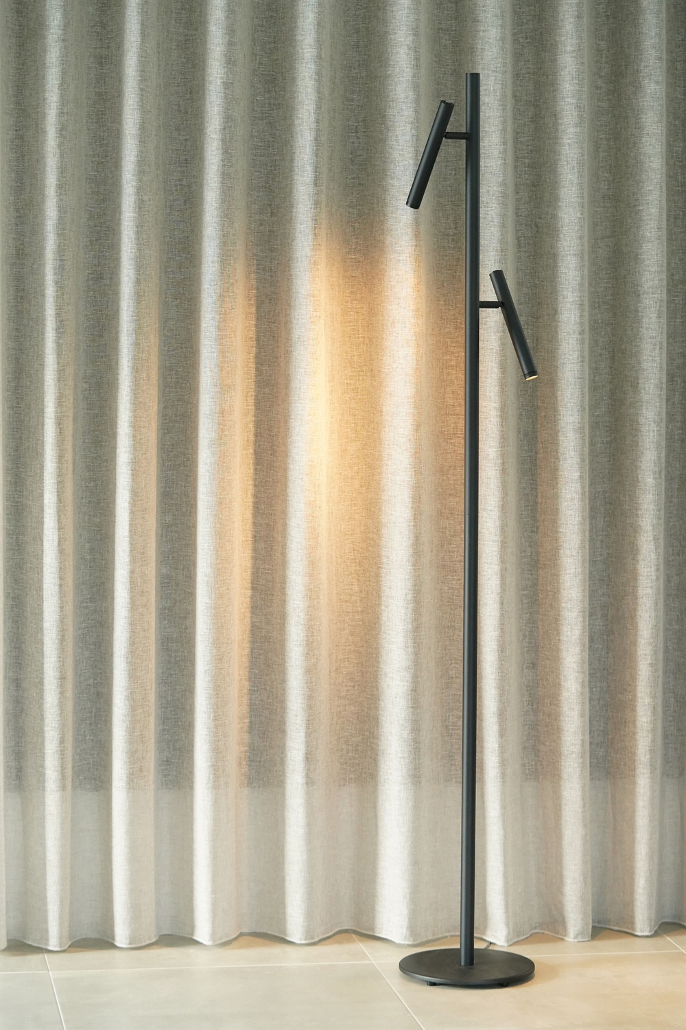 Die zwei Spots an der schlanken Stehleuchte lassen sich unabhängig voneinander verstellen und sind jeweils mit einem Touch-Dimmer ausgestattet, der es einfach macht, die Helligkeit von hellem Arbeitslicht bis hin zu einer gedämpfteren Wohlfühlbeleuchtung zu regulieren.