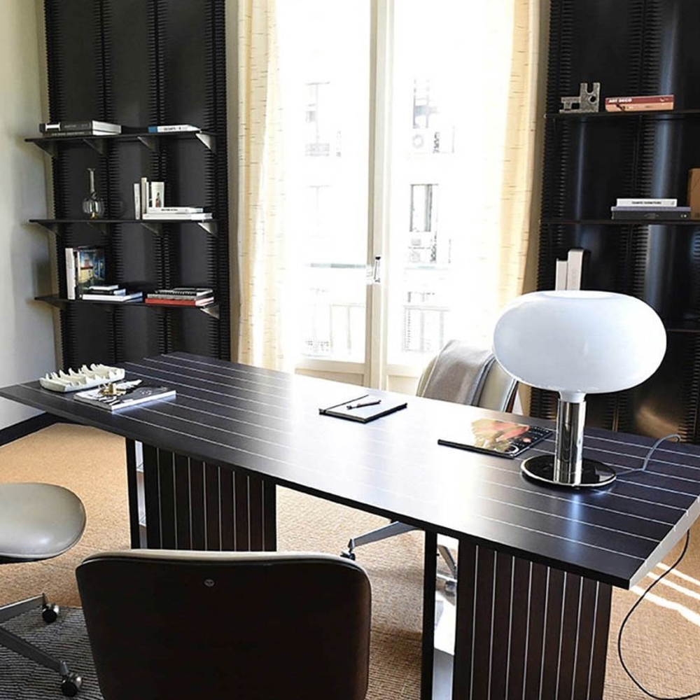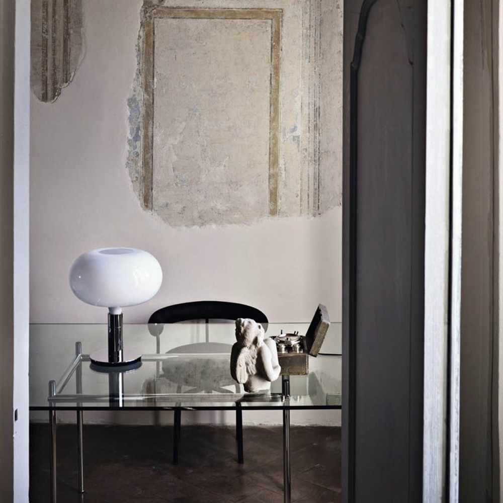 Die AM1N Tischlampe hat ein minimalistisches Design mit verchromtem Sockel und einem Schirm aus weißem Opalglas.