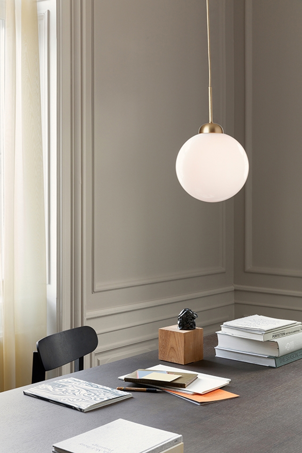 Die Apiales 1 Large Pendelleuchte besteht aus einer mundgeblasenen opalen Glaskugel und satin schwarzen Details. Die elegante Pendelleuchte verleiht dem Raum einen klassischen Ausdruck, ohne andere Elemente zu stören.
