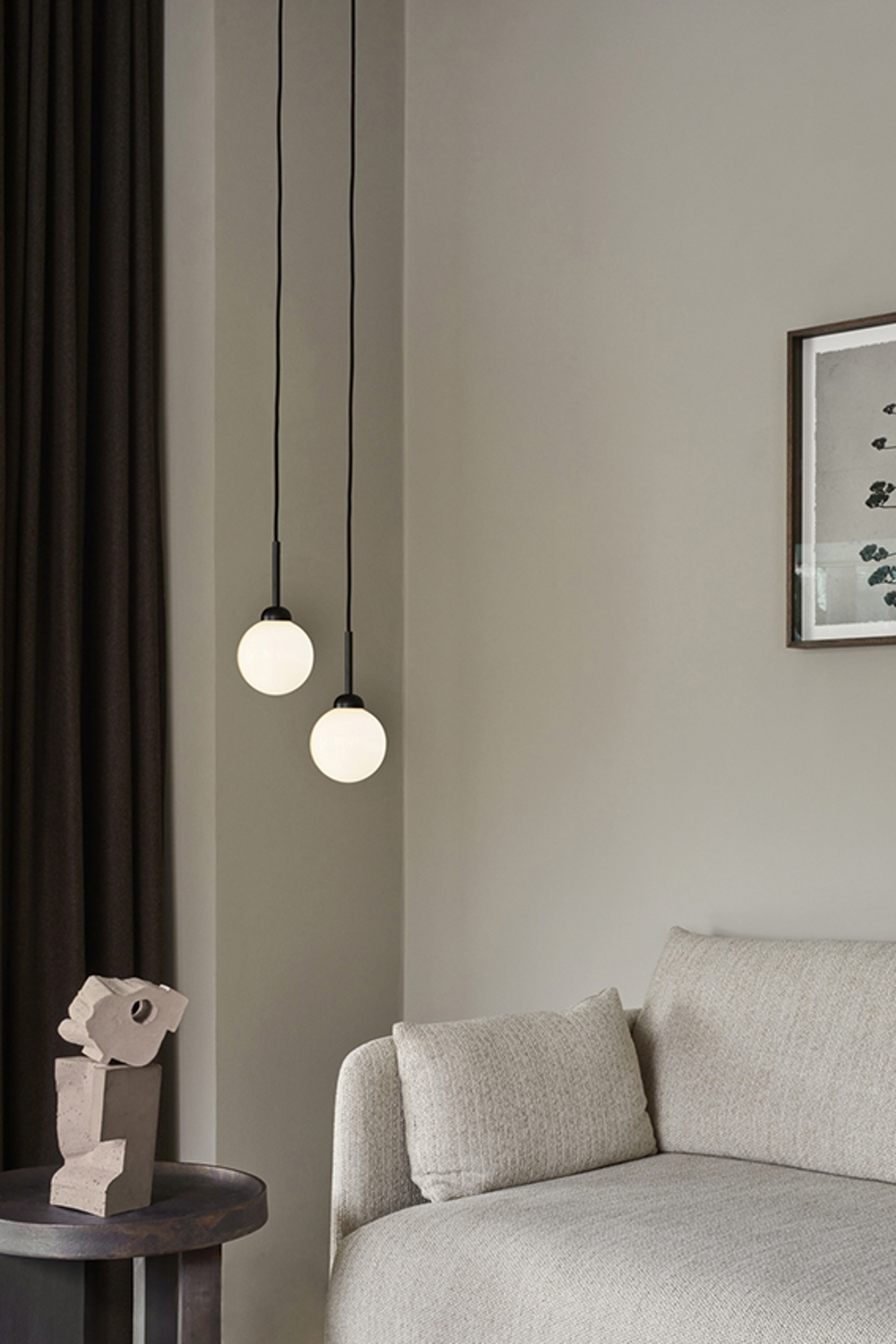 Die Apiales 1 Pendelleuchte besteht aus einer mundgeblasenen Opal-Glaskugel und Details aus gebürstetem Messing. Die elegante Pendelleuchte verleiht dem Raum einen klassischen Ausdruck, ohne andere Elemente zu stören.