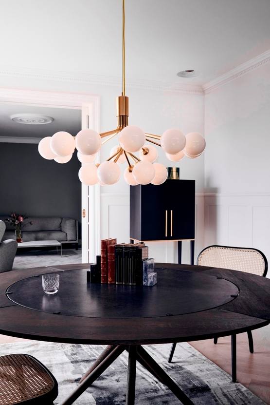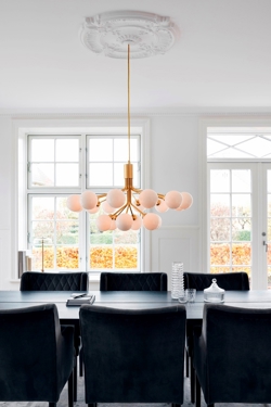 Apiales 18 besteht aus neun mundgeblasenen Glaskugeln und ist in goldener Brushed Brass Finish oder Satin Schwarz erhältlich. Aus einer speziell gefertigten Kappe entfalten sich die feinen Röhren wie Blumenstiele mit den mundgeblasenen Gläsern.