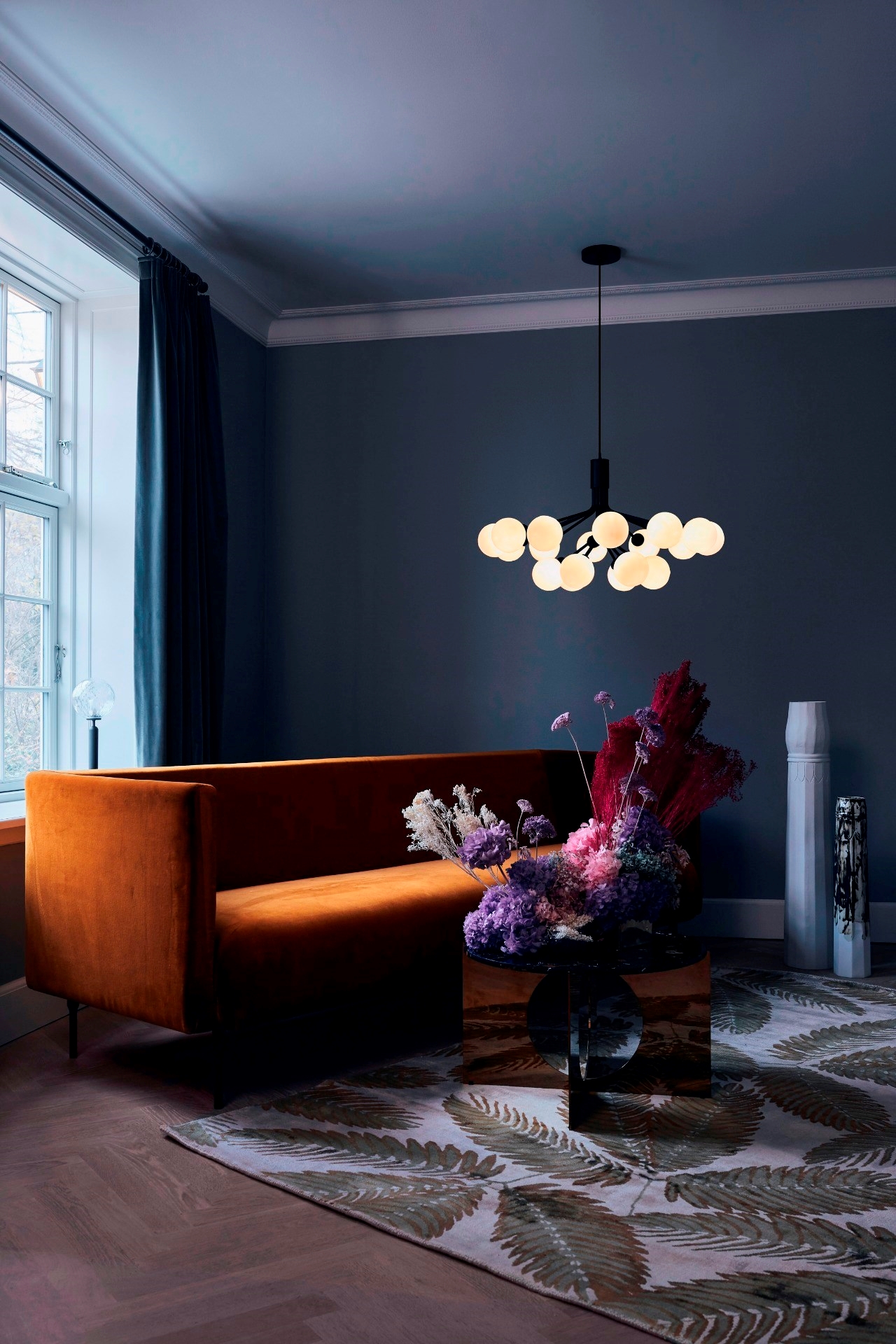 Apiales 18 besteht aus neun mundgeblasenen Glaskugeln und ist in goldener Brushed Brass Finish oder Satin Schwarz erhältlich. Von einer speziell angefertigten Kappe entfalten sich die feinen Röhren wie Blumenstiele mit den mundgeblasenen Gläsern.