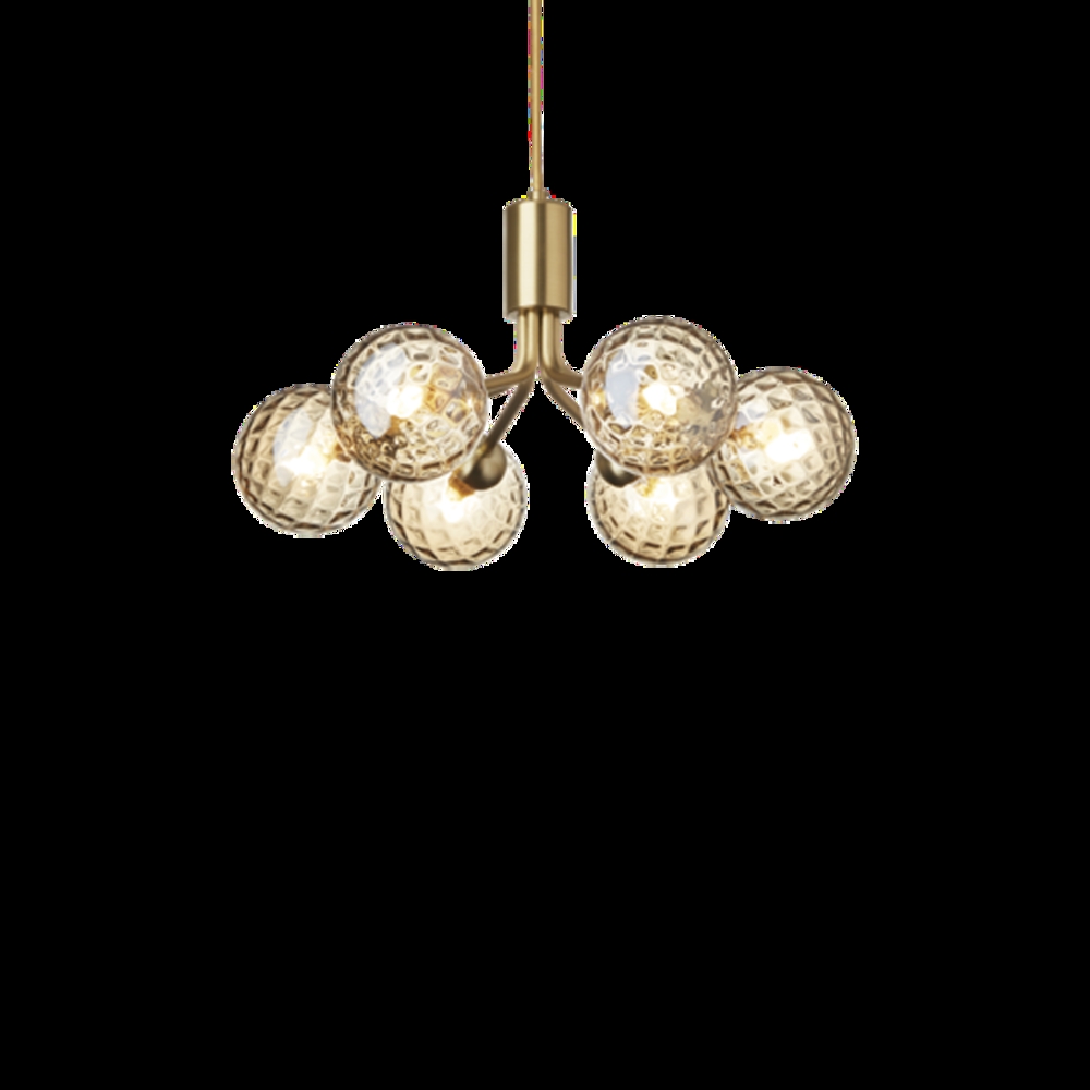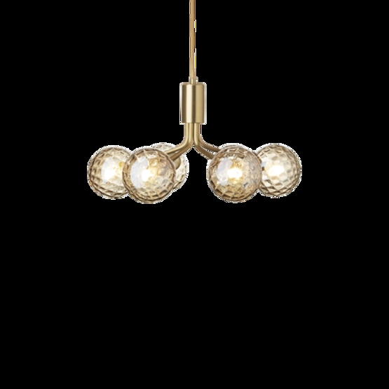 Nuura Apiales 6 Kronleuchter, gebürstetes Messing/Optic Gold Glas - entworfen von Sofie Refer.