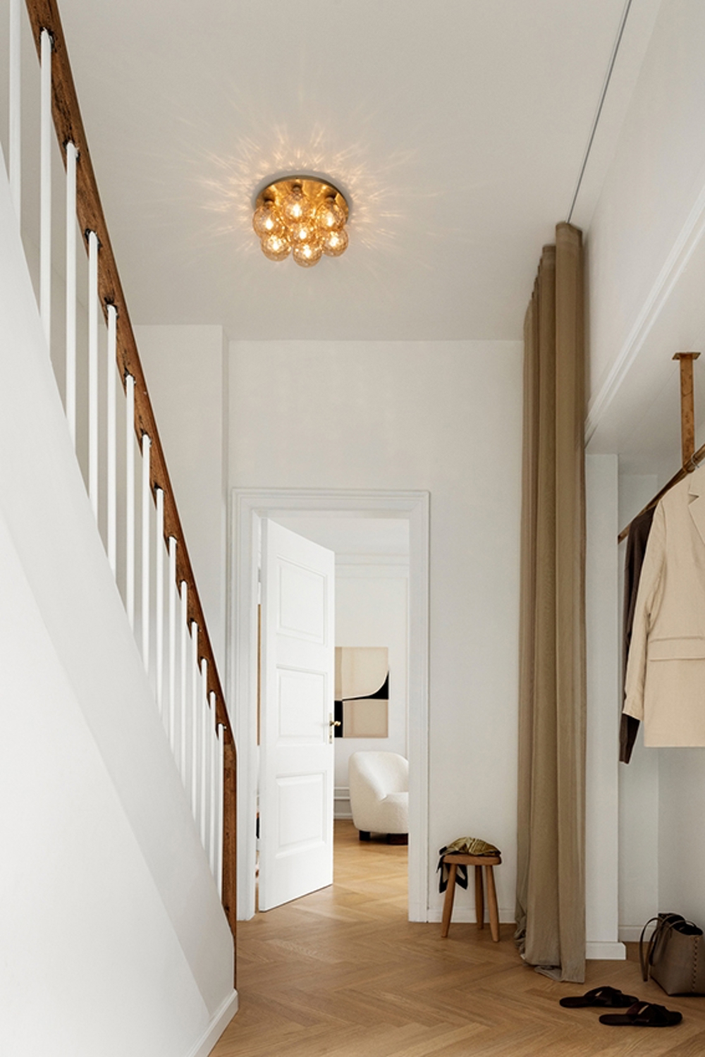 Die Apiales 7 Deckenleuchte wird direkt an der Decke montiert und hat eine niedrige Höhe von 16,5 cm. Dies verleiht der Lampe eine große Vielseitigkeit - und ermöglicht es nun, eine Deckenleuchte/Kronleuchter in Räumen mit niedriger Deckenhöhe oder in Durchgangsbereichen zu haben.