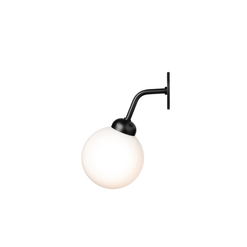 Die Apiales Wandleuchte besteht aus einer mundgeblasenen opalen Glaskugel sowie satin schwarzen Details. Die feine Wandleuchte verleiht dem Raum einen klassischen Ausdruck, ohne andere Elemente im Raum zu stören.