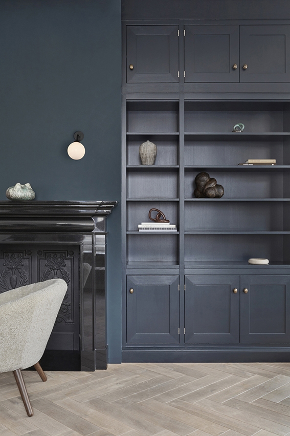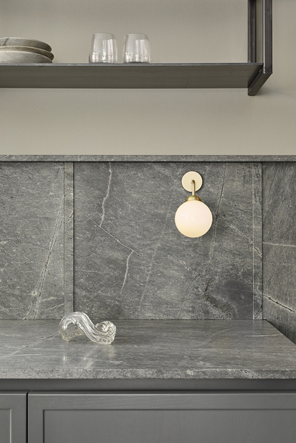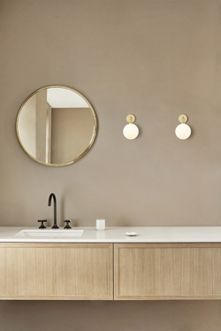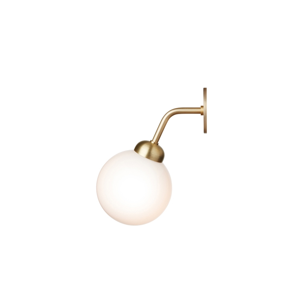 Die Apiales Wandleuchte besteht aus einer mundgeblasenen Opal-Glaskugel sowie Details aus gebürstetem Messing. Die feine Wandleuchte verleiht dem Raum einen klassischen Ausdruck, ohne andere Elemente im Raum zu stören.