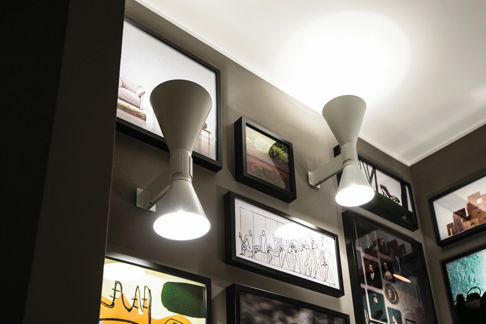 Wandleuchte ist aus Aluminium gefertigt und in Weiß, Schwarz oder Grau erhältlich. Die zwei konischen Schirme der Leuchte ermöglichen es, zwei Bedürfnisse mit einer einzigen Leuchte abzudecken. Applique de Marseille Wandleuchte hat ein schönes Licht und eine clevere Ausstrahlung und passt hervorragend zum Sofabereich oder als Leselampe am Bett.
