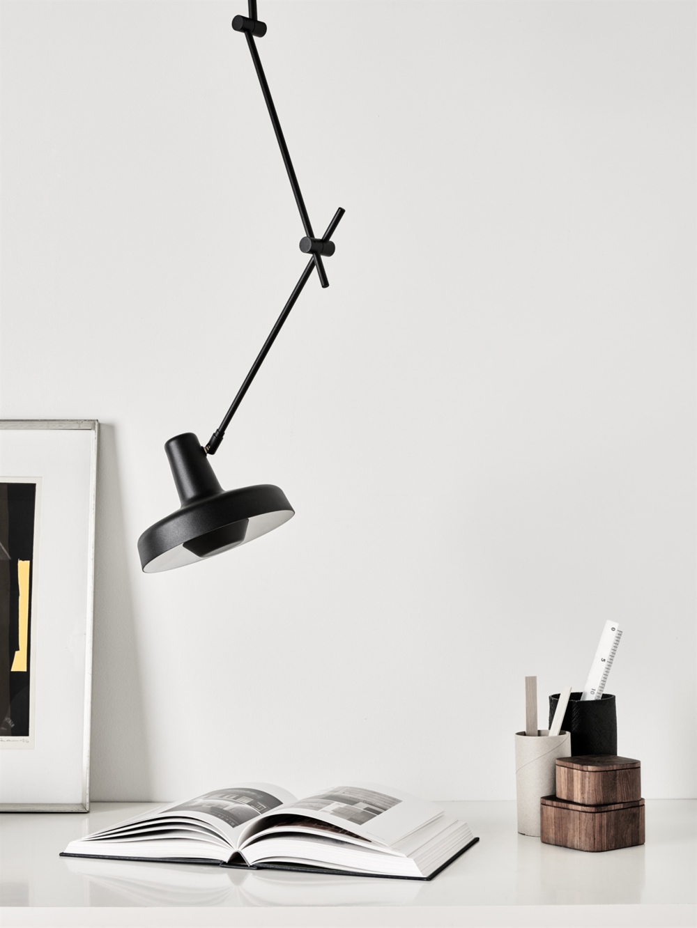 Arigato Leuchten bestehen aus einem Körper aus Stahlrohr und einem Aluminiumschirm. Die Oberfläche ist eine matte schwarze oder weiße Pulverbeschichtung.