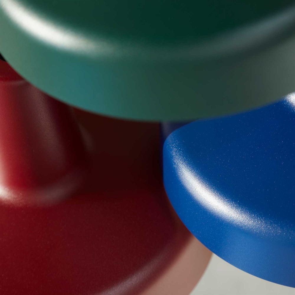 Arigato Leuchten bestehen aus einem Körper aus Stahlrohr und einem Aluminiumschirm. Die Oberfläche war früher nur in mattem Schwarz oder Weiß pulverbeschichtet - jetzt gibt es mehrere Varianten auch in Blau, Rot und Grün.