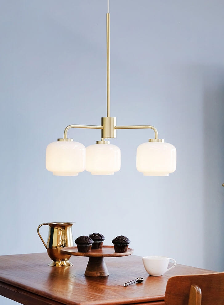 Der Arp Kronleuchter aus Opalglas und mattem Messing balanciert Form und Funktion und sorgt für ein angenehmes Licht. Die drei Lampenarme mit jeweils eigenem Schirm tragen zu einem Design bei, das klassisches und modernes Design vereint. Der Kronleuchter eignet sich perfekt über dem Esstisch oder im Flur oder Wohnzimmer, wo er selbst zu einer stilvollen Einrichtung beiträgt.