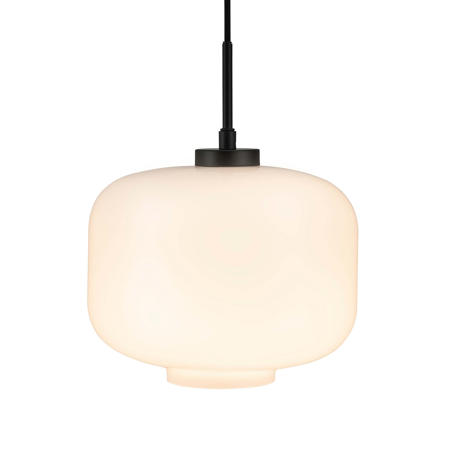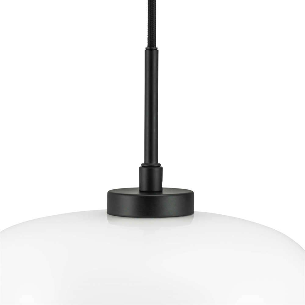 Die Arp Pendelleuchte mit einem Lampenschirm aus Opalglas und einer Aufhängung aus mattschwarzem Metall ist klassisches Design mit angenehmem Licht. Die Lampe passt sowohl in moderne als auch klassische Einrichtungen und kann einzeln oder in Gruppen im Wohnzimmer, Küche, Schlafzimmer oder an jedem anderen Ort mit Bedarf an guter Beleuchtung aufgehängt werden.