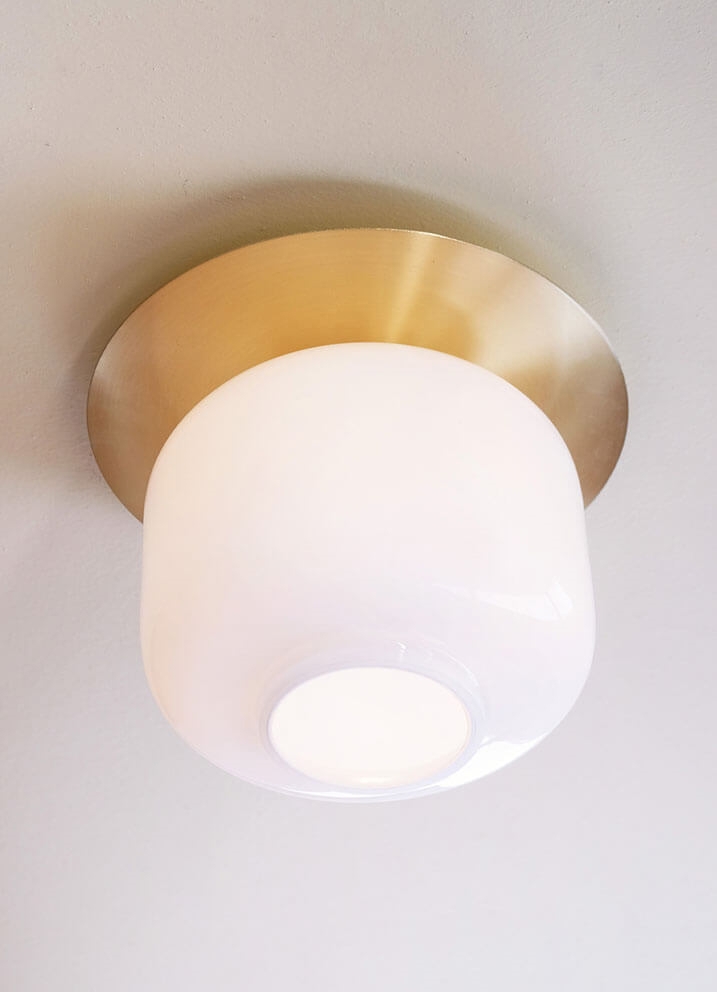 Die Arp Deckenleuchte in mattem Messing und Opalglas wird nah an der Decke montiert und bietet ein schönes Zusammenspiel zwischen Decke, Messingplatte und Glasschirm. Die Lampe passt sowohl in moderne als auch klassische Einrichtungen und sorgt für angenehmes Licht im Wohnzimmer, Schlafzimmer oder einem anderen Raum des Hauses.