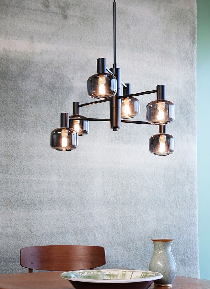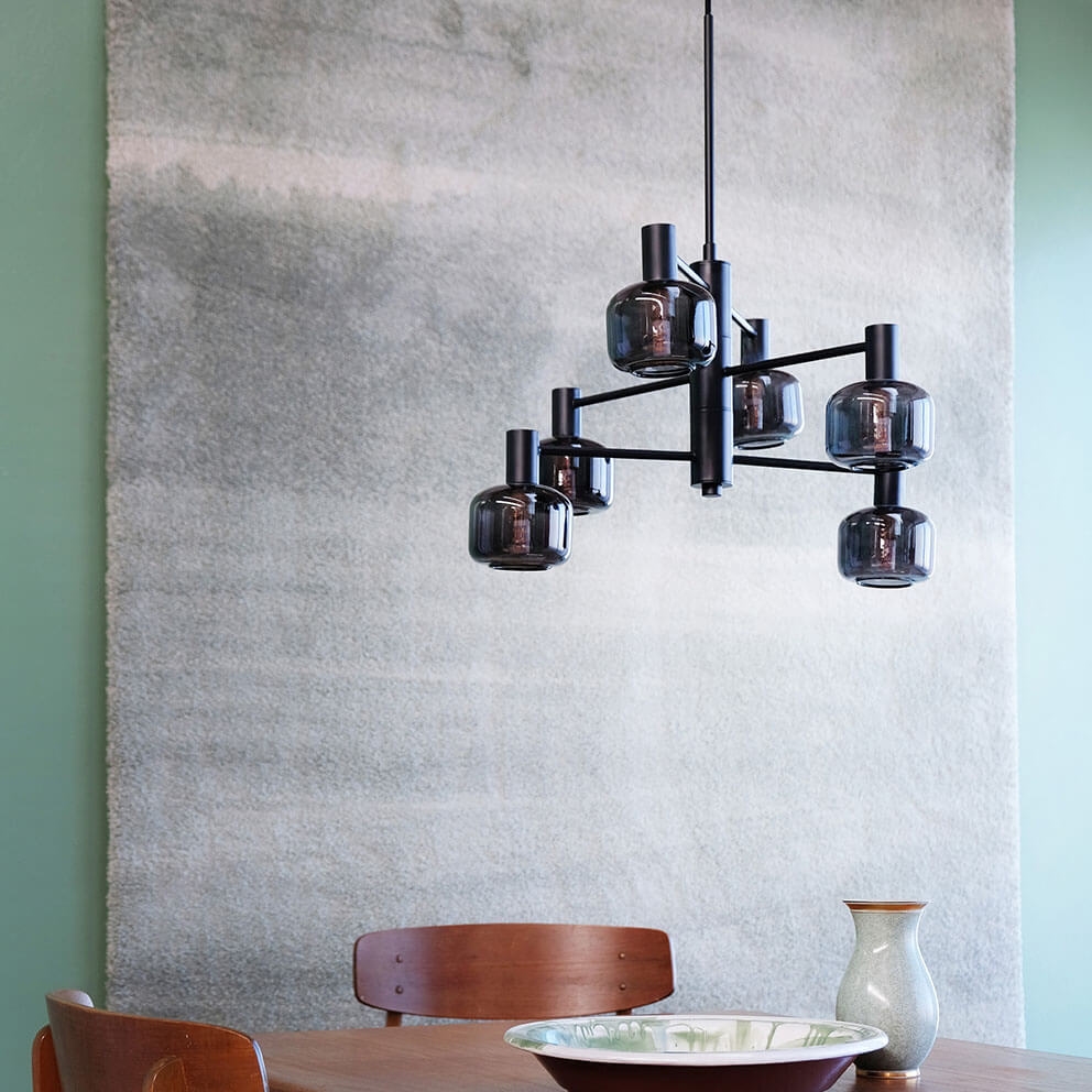 Der Arp Kronleuchter mit 6 Glaskugeln aus Rauchglas und schwarzer Aufhängung ist dänisches Design, das eine wunderschöne Beleuchtung bietet. Der Kronleuchter eignet sich perfekt über dem Esstisch oder im Eingangsbereich oder Wohnzimmer, wo er selbst zu einer stilvollen Einrichtung beiträgt.