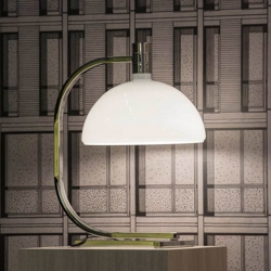 Die AS1C Tischlampe hat ein minimalistisches Design mit verchromtem Sockel und einem Schirm aus weißem Opalglas.