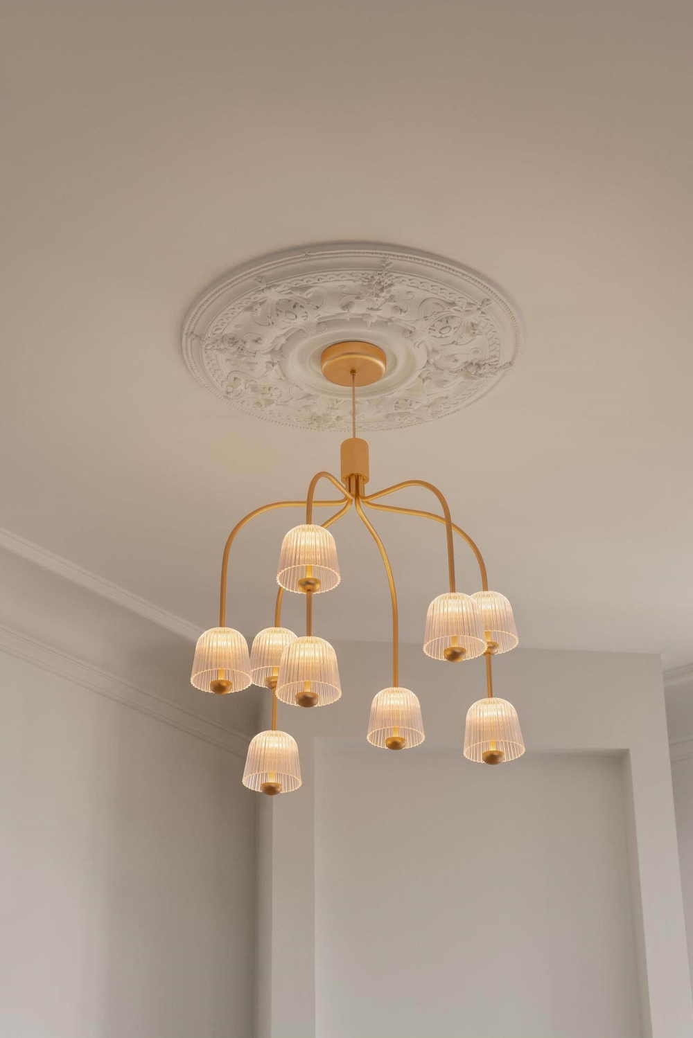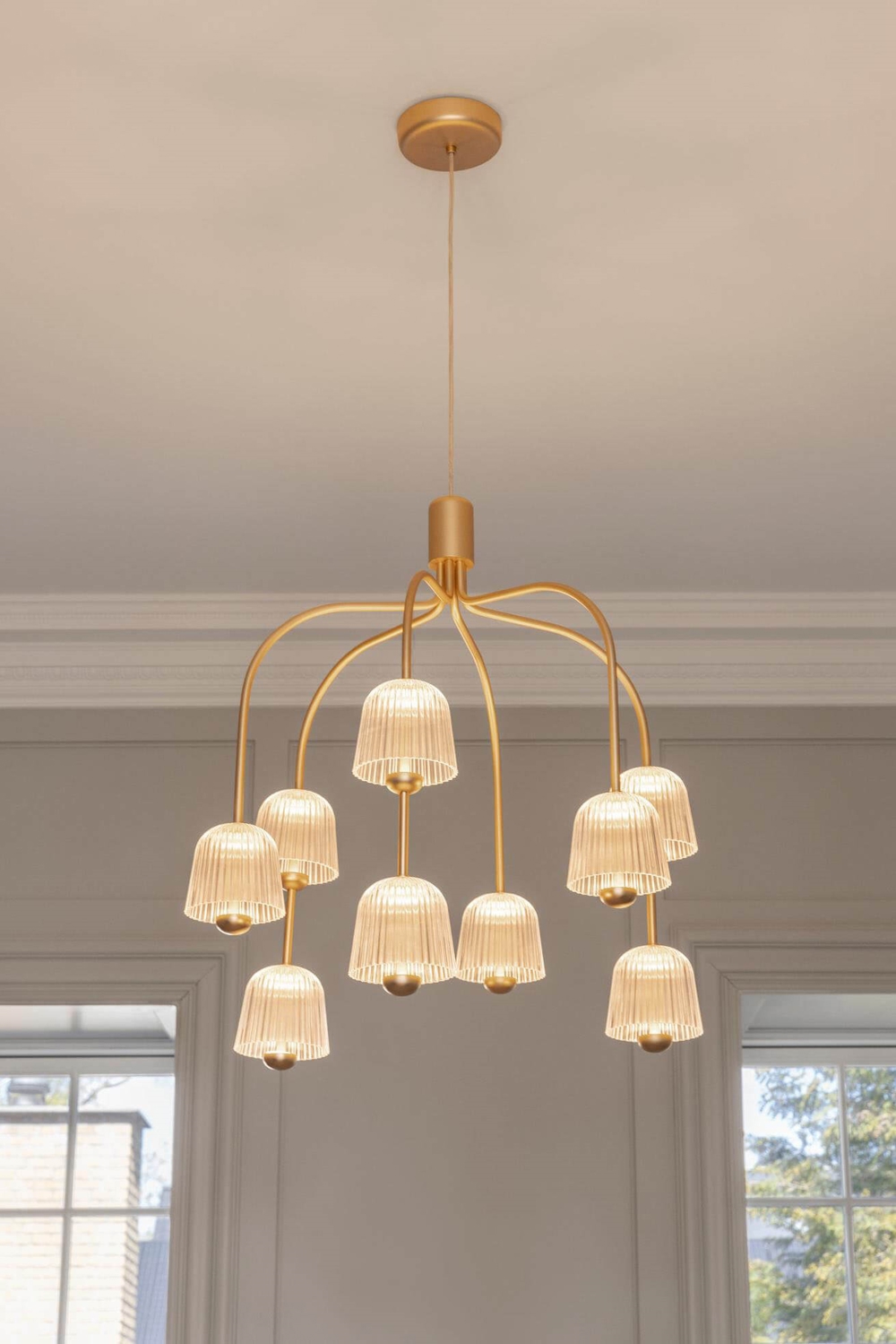 Der Kronleuchter Asteea 9 mit Satin Messing Finish und klaren Acrylschirmen hat eine einzigartige Konstruktion mit zwei der glockenförmigen Schirme an jedem zweiten Arm. Das elegante Design hat eine Leichtigkeit im Ausdruck und sorgt für eine weiche und blendfreie Beleuchtung mit einem lebendigen Spiel zwischen Licht und Schatten von den geriffelten Schirmen.