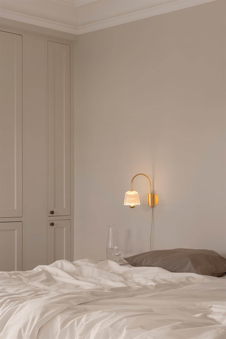 Die Wandleuchte Asteea mit dem charakteristischen glockenförmigen Acrylschirm der Lampenserie und der Konstruktion mit Satin-Messing-Finish hat ein stilvolles und exklusives Design. Die Lampe ist dimmbar und der gebogene Lampenarm kann gedreht werden, sodass das Licht nach Bedarf angepasst werden kann. Nutzen Sie beispielsweise das angenehme Licht der Wandleuchte im Wohnzimmer, wo die geriffelte Struktur des klaren Schirms ein lebendiges Lichtspiel erzeugt und dem Raum Wärme und Charakter verleiht.