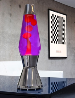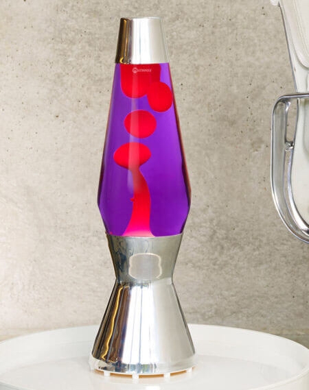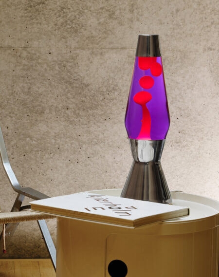 Die originale Lavalampe Astro, entworfen 1963 von Edward Craven Walker, der die Lavalampe erfand und Mathmos gründete. Diese Variante des Designklassikers hat eine handgesponnene Basis und einen Deckel aus Aluminium mit polierter Silberoberfläche. Die Flasche in Violett mit rotem Lava ist manuell gefüllt und basiert auf Mathmos’ einzigartigem Lavarezept, das bis zu 2.000 Stunden Nutzung bietet, bevor die Flasche ausgetauscht werden muss.