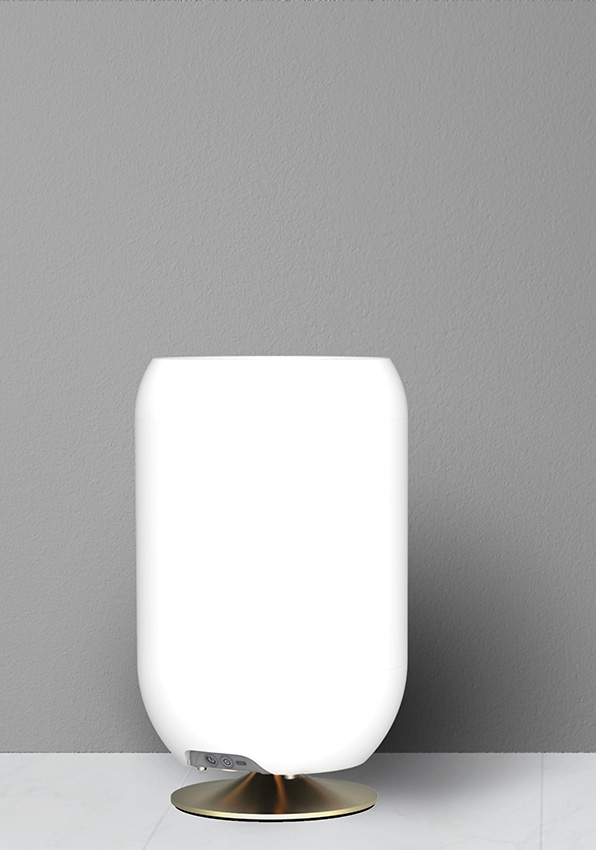 Kooduu Atmos LED Akkulampe mit integriertem Lautsprecher und Getränkekühler in Messing - entworfen von Jacob Jensen Design.