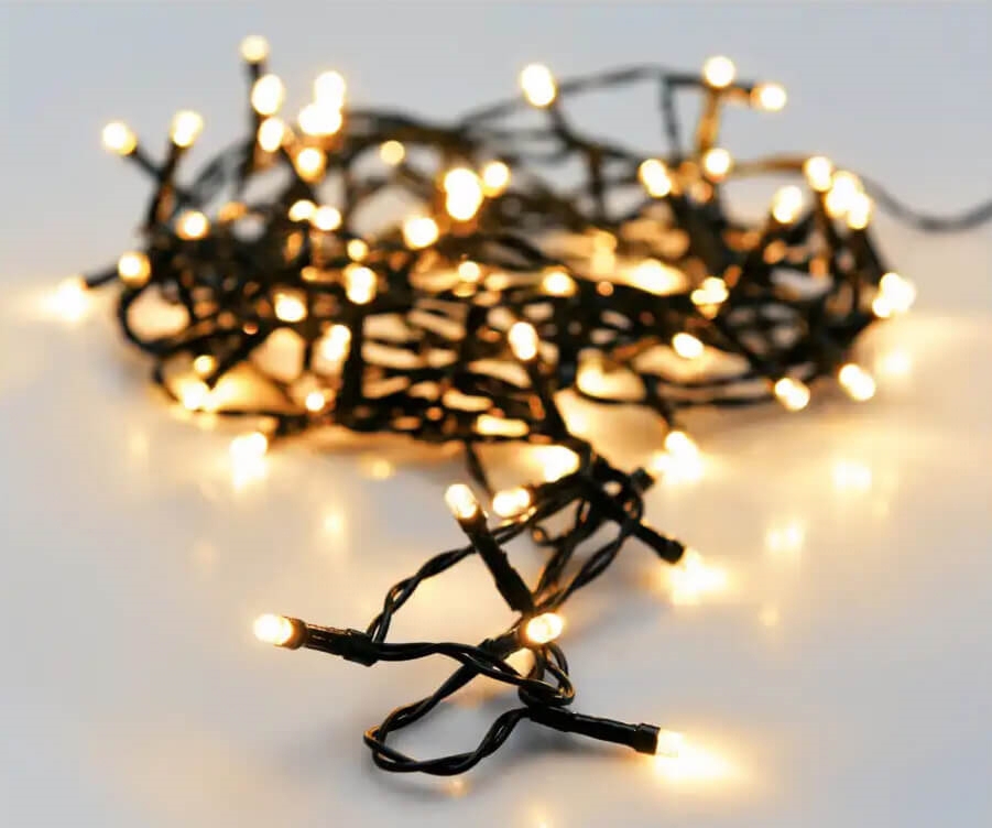 Schaffen Sie Stimmung und Atmosphäre im Freien mit dieser gemütlichen Lichterkette mit schwarzem Kabel. Die Kette hat 120 LED-Lichter mit einem Abstand von 7,5 cm zwischen jedem Licht, die in einem warmen Weiß leuchten. Die Gesamtlänge inklusive 3 Meter Kabel vor den LED-Lichtern beträgt 12 Meter. Hängen Sie die Lichterkette in einen Baum oder nutzen Sie sie, um Stimmung auf der Terrasse oder dem Balkon zu schaffen.