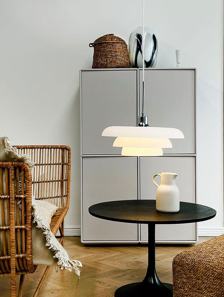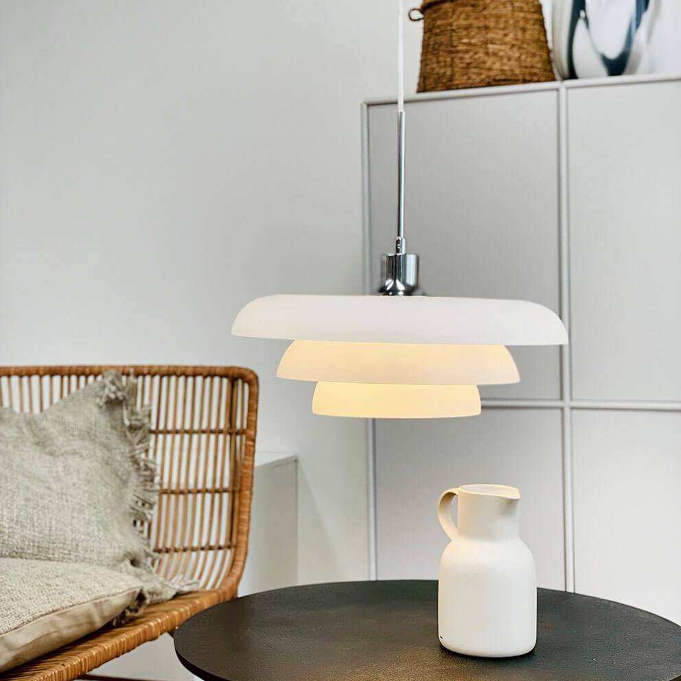 Die Ava Pendelleuchte in Opal und Chrom ist dänisches Design, das sowohl in klassische als auch moderne Einrichtungen passt. Die Leuchte strahlt ein weiches und angenehmes Licht aus und kann mit ihrem minimalistischen Design beispielsweise in der Küche, im Wohnzimmer oder über dem Esstisch verwendet werden.