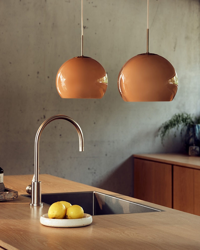 Das schöne Design der Ball-Serie ist klassisch und ikonisch, und die Lampe ist in vielen Varianten und schönen Farben erhältlich. Mit der Variante Ball Glass erhält das einfache und zeitlose Design eine zusätzliche Dimension, die Wärme und Atmosphäre mit opalweißem oder getöntem Glas in die Einrichtung bringt. Zusammen mit einer perforierten Metallplatte oben fügt die Verwendung von Glas Benny Frandsens ikonischem Design eine moderne Ästhetik hinzu.