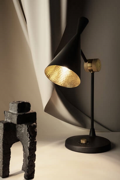 Die Tischleuchte der Beat-Serie ist wie die anderen Leuchten der Serie von der skulpturalen Einfachheit klassischer indischer Wassergefäße inspiriert. Der Schirm wird von Handwerkern in Nordindien aus Messing gefertigt, nach einem alten Verfahren, das vier Tage dauert. Die moderne Tischleuchte hat einen schlanken, verstellbaren Arm und spendet ein weiches, warmes Licht.