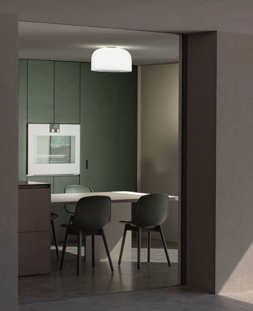 Bellhop Glas ist neben der Deckenleuchte auch als Pendelleuchte in zwei Größen mit Oberteil in den Farben Weiß, Cioko oder Bright Aluminium erhältlich. Es gibt auch Tischlampen in der Lampenserie.