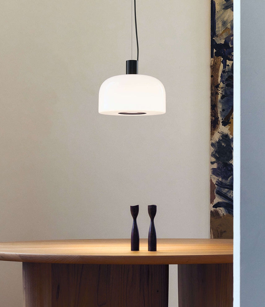 Bellhop Glas die Pendelleuchte ist in zwei Größen erhältlich und neben der cioko-Oberseite auch mit weißer oder heller Aluminiumoberseite. Es gibt auch eine Deckenleuchte und eine Tischleuchte in der Lampenserie.