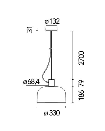 Der Schirm besteht aus Opalglas, das als Sandwich aus drei Glasschichten aufgebaut ist, wobei die weiße Schicht zwischen zwei transparenten Schichten eingefügt ist. Die Öffnung am unteren Ende des Schirms ist durch einen Aluminiumring geschützt, der zur Oberseite der Pendelleuchte passt.