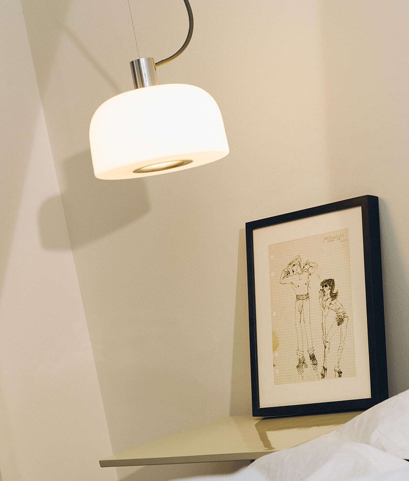 Der Schirm besteht aus Opalglas, das als Sandwich aus drei Glasschichten aufgebaut ist, wobei die weiße Schicht zwischen zwei transparenten Schichten eingefügt ist. Die Öffnung am unteren Ende des Schirms ist durch einen Aluminiumring geschützt, der zur Oberseite der Pendelleuchte passt.