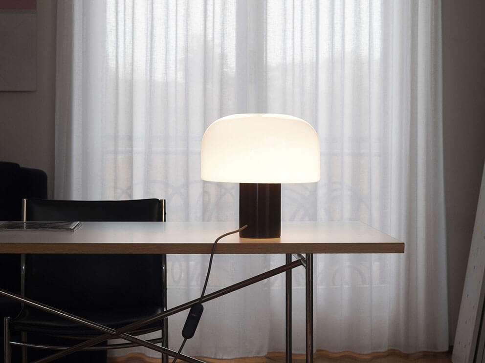 Die Bellhop Glas Tischleuchte ist neben der Basis in cioko auch mit einer Basis in Weiß oder hellem Aluminium erhältlich. Es gibt auch eine Pendel- und Deckenleuchte in der Lampenserie.