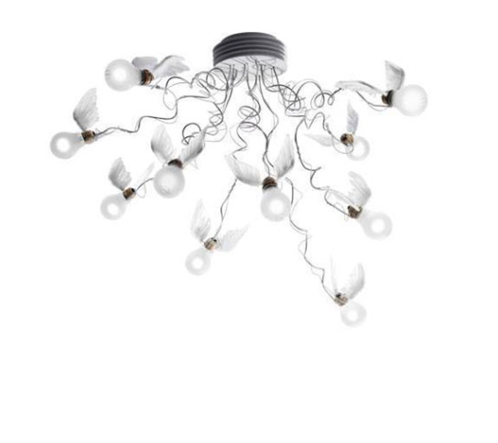 Die Deckenleuchte Birdie ist Teil von Ingo Maurers Flügelleuchtenserie, die auch den beeindruckenden Kronleuchter Birds Birds Birds sowie die Wand- und Tischleuchte Lucellino umfasst, die zu Ingo Maurers bekanntesten Werken gehören.