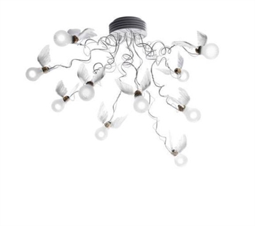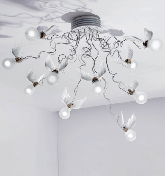 Die Deckenleuchte Birdie's Nest von Ingo Maurer besteht aus 10 LED-Lichtquellen, die mit Flügeln aus Gänsefedern versehen sind.