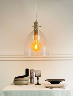 Mit einem Design aus klarem Glas, kombiniert mit Eichenholz und Details aus Messing sowie einem schwarzen Stoffkabel, verkörpert Bistro zeitlose Eleganz mit einem exklusiven Ausdruck. Die Pendelleuchte ist eine ideale Wahl für kleinere Bereiche, kann aber auch allein oder in Gruppen die Küchenarbeitsplatte beleuchten oder als stilvolle Beleuchtung über dem Esstisch dienen.