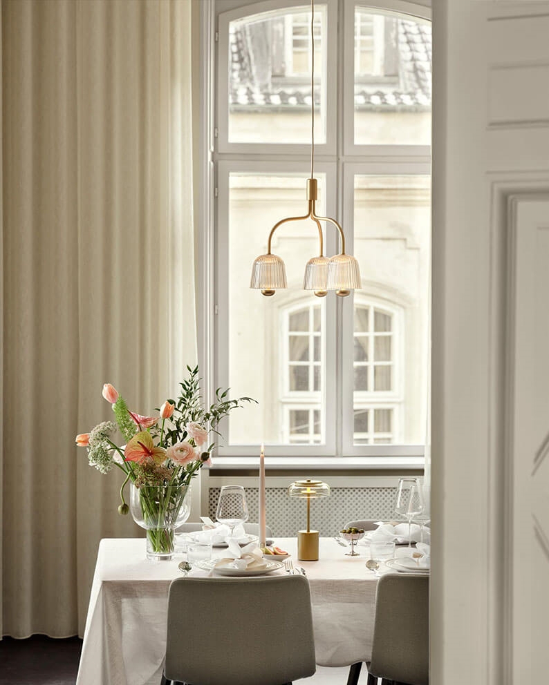 Blossi ist als verschiedene Tischleuchten sowie als Pendelleuchte, Wandleuchte, Stehleuchte und Kronleuchter erhältlich.