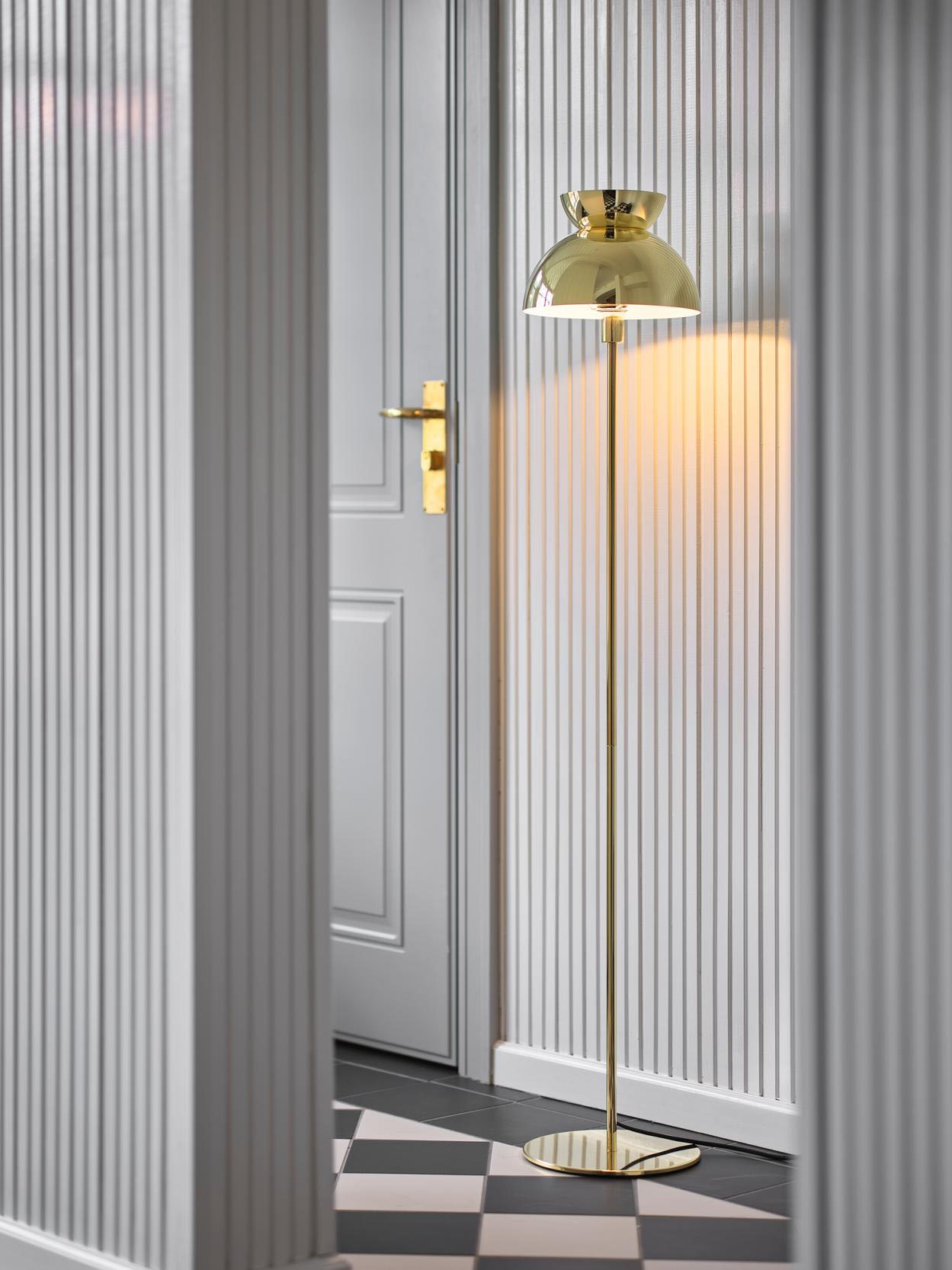 Die Schirm der Butterfly Stehlampe besteht aus drei Halbkugeln, die gegeneinander versetzt sind. Sie schaffen eine spannende, kontrastreiche Harmonie, inspiriert vom nordischen Designstil.