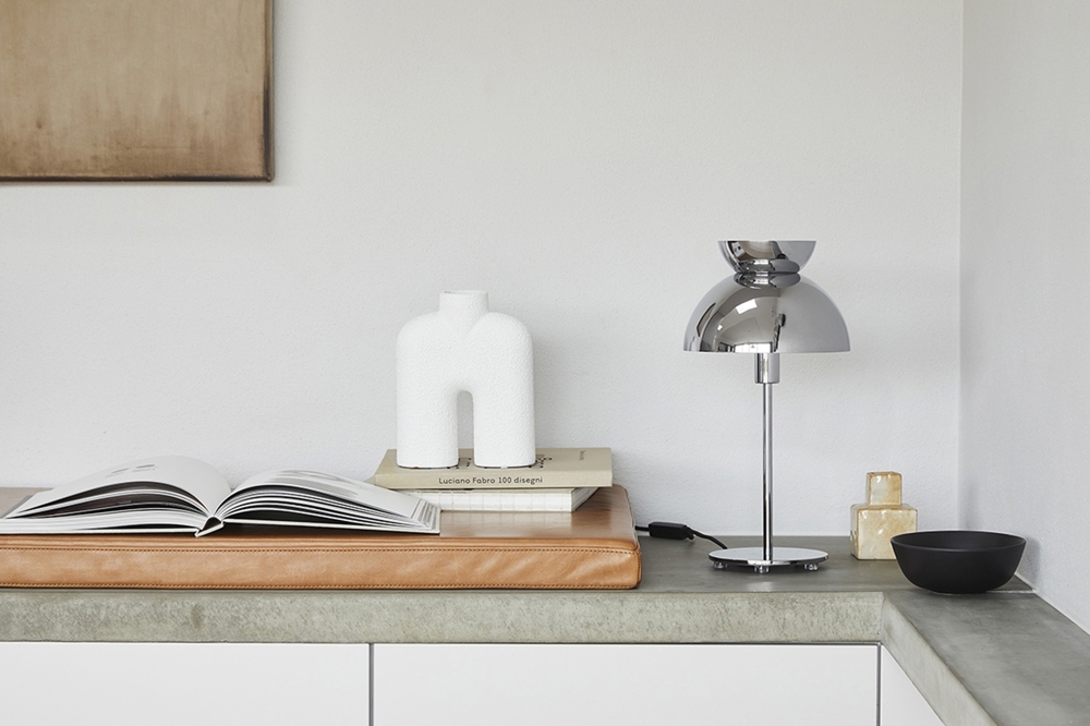 Der Schirm der Butterfly Tischleuchte besteht aus drei Halbkugeln, die gegeneinander versetzt sind. Sie schaffen eine spannende, kontrastreiche Harmonie, inspiriert vom nordischen Designstil.