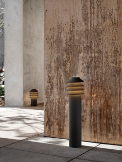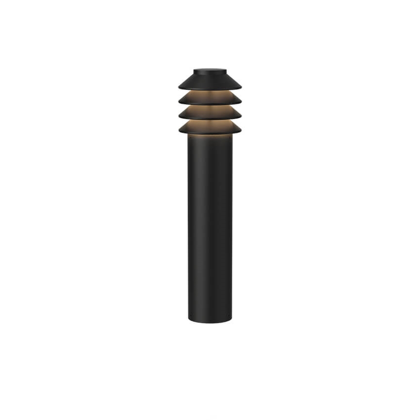 Der Bysted Gartenpoller besteht aus vier Ringen, die das Licht nach unten lenken. Das ausgestrahlte Licht ist ausgewogen und weich, wodurch ein charakteristisches Muster auf dem Boden entsteht.