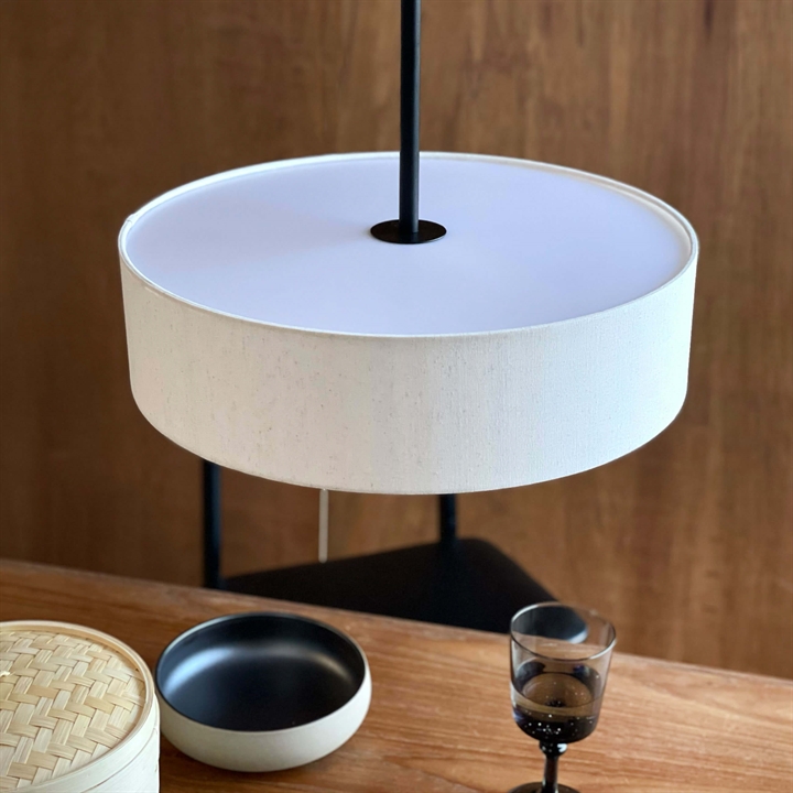 Dyberg Larsen Calix Pendelleuchte mit schwarzem Top und naturfarbenem niedrigem Stoffschirm