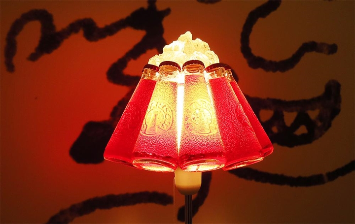 Ingo Maurer Campari Bar Tischleuchte besteht aus zehn originalen Campari Soda Flaschen, die einzeln abnehmbar sind. Hergestellt aus Kunststoff, Metall, Glas und Porzellan. Über den zehn originalen Campari Soda Flaschen befinden sich Eiswürfel aus Glas, die das Licht reflektieren. Mit Zugschalter.