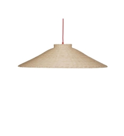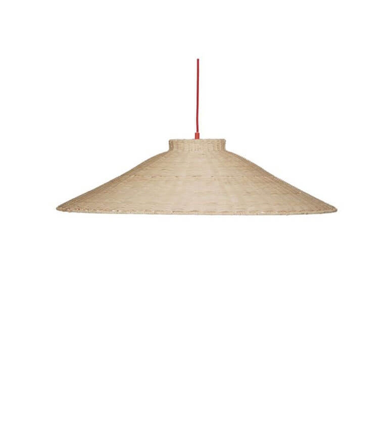 Diese schöne Pendelleuchte verleiht einen sehr natürlichen und ruhigen Ausdruck, jedoch gibt das rote Kabel der Lampe einen frischen Akzent. Das Licht wirkt durch die geflochtene Struktur des Schirms sehr angenehm. Die Pendelleuchte hat eine schöne Trapezform, die ein breites Lichtspektrum bietet, das sowohl über dem Couchtisch als auch im Schlafzimmer gut zur Geltung kommt.