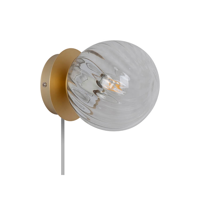 Die Chisell Wandleuchte erzeugt ein schönes Muster an der Wand um sich herum, da die gewirbelte Glaskugel das Licht rundherum streut. Das Glas ist mundgeblasen und die Lampe hat schöne messingfarbene Details. Aufgrund des handgefertigten mundgeblasenen Glases können kleine Luftblasen im Glas auftreten. Dies verleiht der Lampe jedoch ihren eigenen Charakter und ein lebendiges Aussehen.