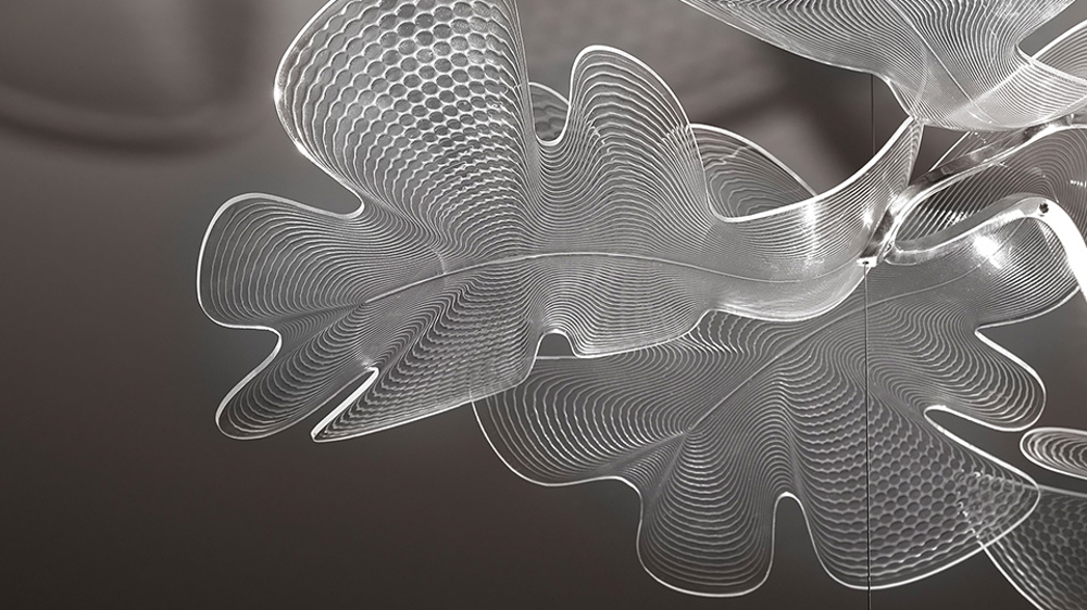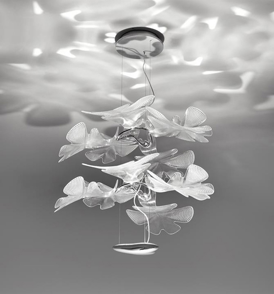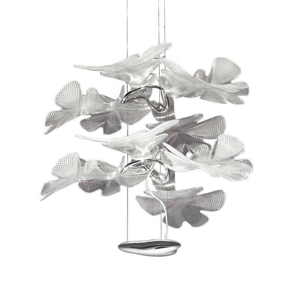 Schöne Pendelleuchte mit einem Gestell aus Aluminium und Blättern aus transparentem Kunststoff. Die Pendelleuchte unterstreicht sowohl Artemides als auch Ross Lovegroves unglaubliche Fähigkeiten, Beleuchtung zu entwerfen, die innovativ und organisch in ihrer Form ist.