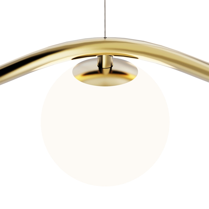 Der Kronleuchter Circle of Life ist raffinierter skandinavischer Minimalismus mit einem eleganten Ausdruck, inspiriert von den Höhen und Tiefen des Lebens. Der skulpturale Rahmen aus handgefertigtem poliertem Messing hat organische Kurven und fünf mundgeblasene Kugelschirme aus Opalglas. Der Kronleuchter strahlt ein weiches Licht aus und eignet sich hervorragend als Beleuchtung über dem Esstisch oder als Mittelpunkt im Wohnzimmer, in der Küche oder im Flur.