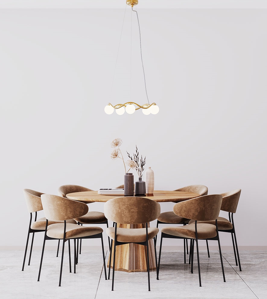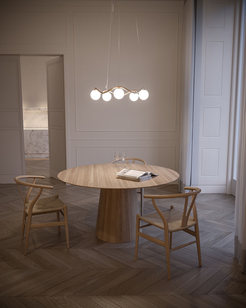 Der Kronleuchter Circle of Life ist raffinierter skandinavischer Minimalismus mit einem eleganten Ausdruck, inspiriert von den Höhen und Tiefen des Lebens. Der skulpturale Rahmen aus handgefertigtem, poliertem Messing hat organische Kurven und fünf mundgeblasene Kugelschirme aus Opalglas. Der Kronleuchter spendet ein weiches Licht und eignet sich hervorragend als Beleuchtung über dem Esstisch oder als Mittelpunkt im Wohnzimmer, in der Küche oder im Eingangsbereich.