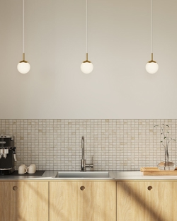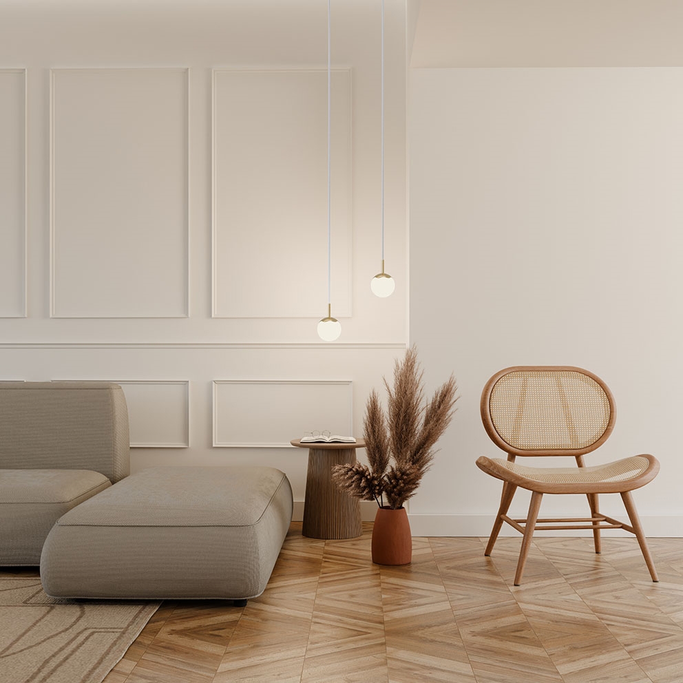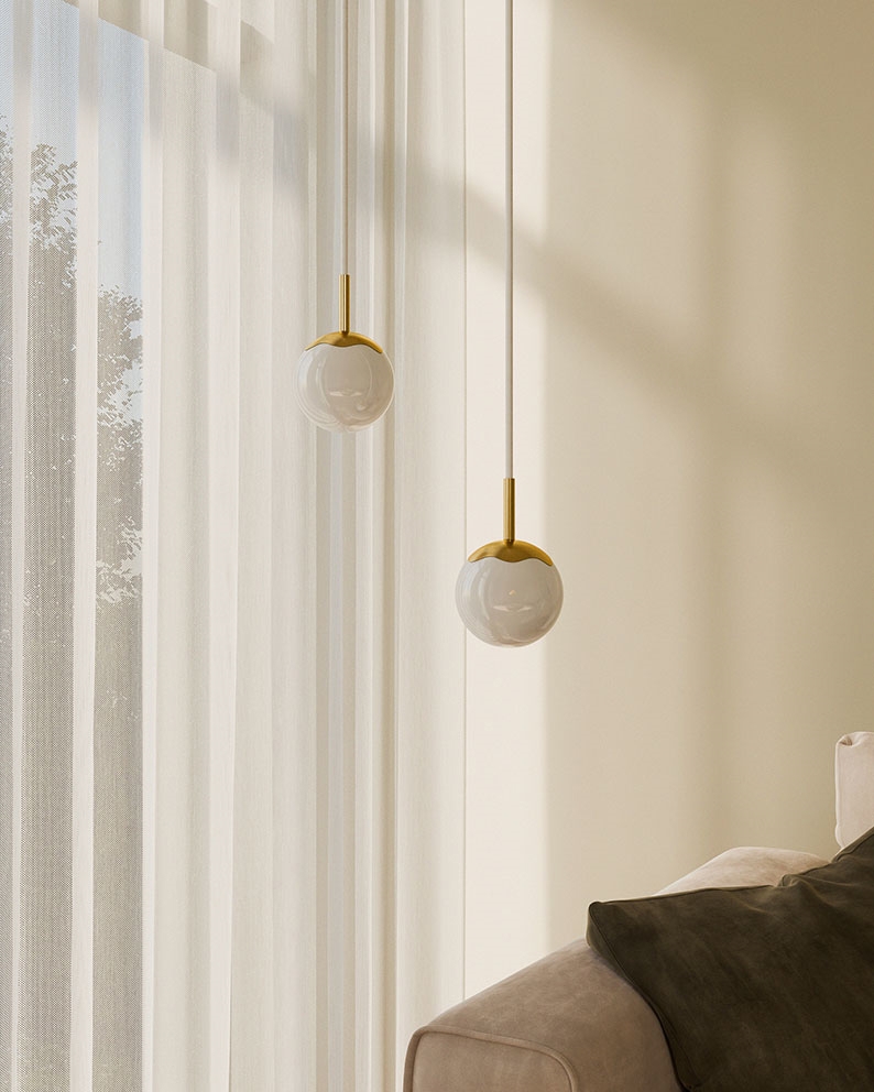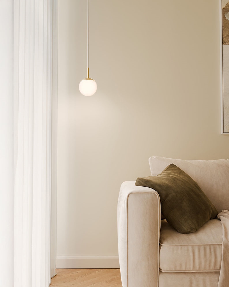 Die Pendelleuchte Circle of Life hat ein kompaktes und elegantes skandinavisches Design, inspiriert von den Höhen und Tiefen des Lebens. Der leichte nordische Ausdruck der Lampe wird bei dieser Variante durch das weiße Stoffkabel hervorgehoben, während die handgefertigte polierte Messingoberseite Wärme und Exklusivität zum Design hinzufügt. Der kugelförmige Schirm aus mundgeblasenem Opalglas sorgt für ein weiches und angenehmes Licht.