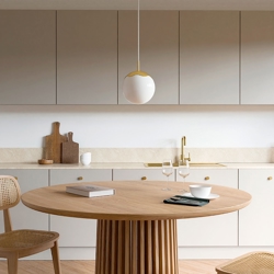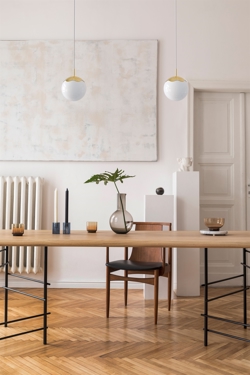 Die Pendelleuchte ist in zwei Größen mit weißem oder schwarzem Stoffkabel erhältlich. Diese große Größe eignet sich hervorragend als Beleuchtung über dem Esstisch oder als Mittelpunkt im Wohnzimmer, in der Küche oder im Flur. Es gibt auch Kronleuchter in der Lampenserie.