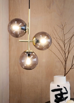 Die Como Pendelleuchte mit drei Rauchglaskugeln und dem restlichen Design in Messing kann einzeln oder in Gruppen aufgehängt werden. Das Licht der Glaskugeln strahlt sowohl nach außen als auch nach unten, sodass die Pendelleuchte über dem Esstisch, im Flur oder an anderen Stellen im Haus verwendet werden kann, wo sie sowohl ein Blickfang als auch funktional sein wird.