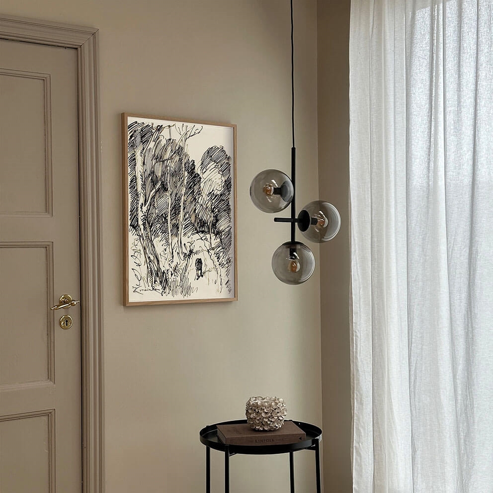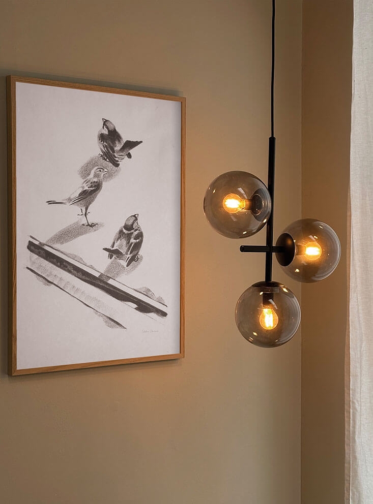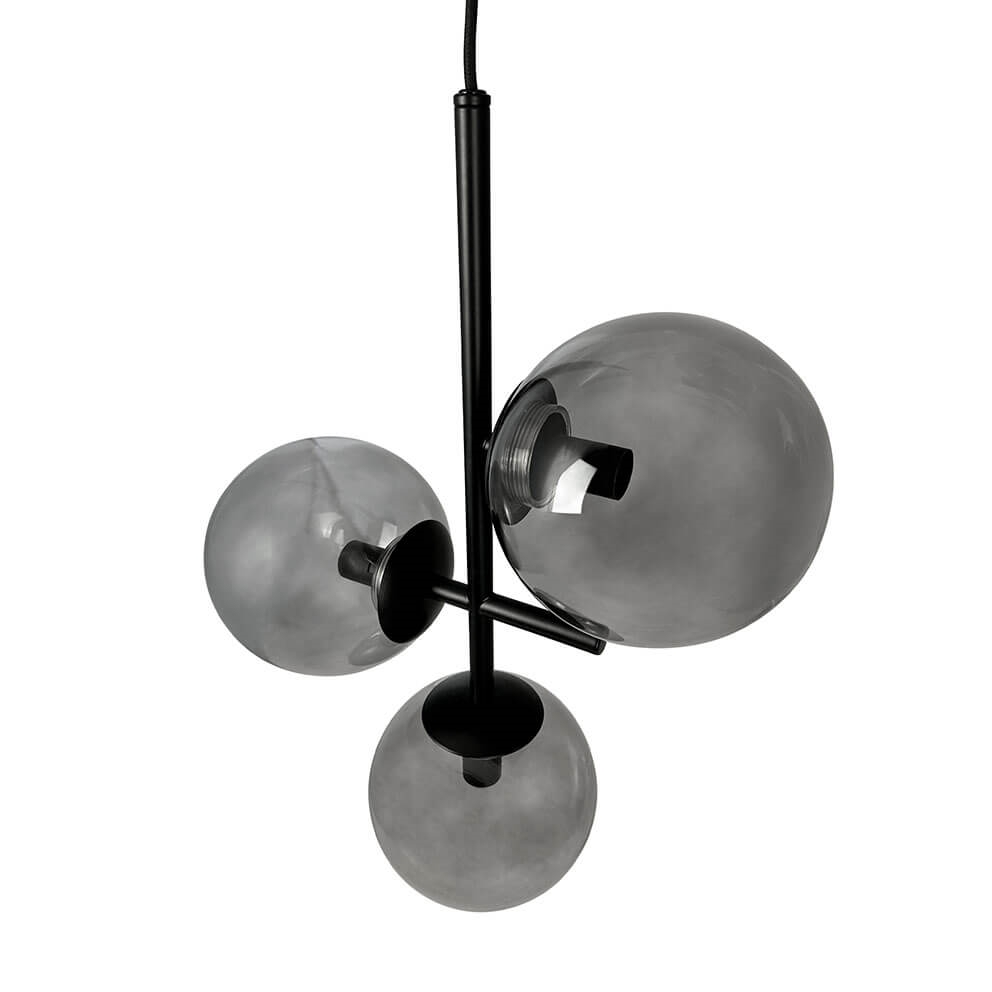 Die Como Pendelleuchte mit drei Rauchglaskugeln und dem restlichen Design in schwarzem Metall kann einzeln oder in Gruppen aufgehängt werden. Das Licht der Glaskugeln strahlt sowohl nach außen als auch nach unten, sodass die Pendelleuchte über dem Esstisch, im Flur oder an anderen Stellen im Haus verwendet werden kann, wo sie sowohl ein Blickfang als auch funktional sein wird.